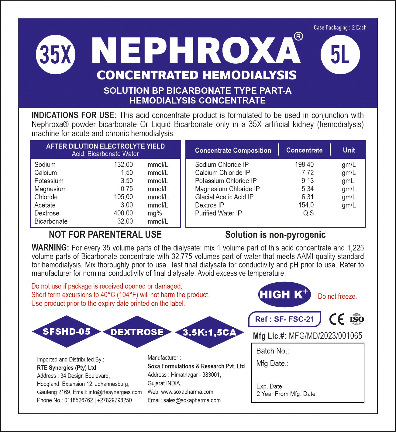 35X NEPHROXA Concentrated Hemodialysis PART A , SFSHD-05 Dextrose – 1.5K:1.5 CA, HIGH K+ 5L